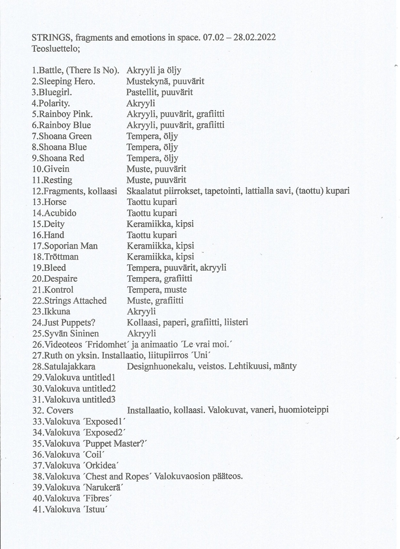 STRINGS, fragments & emotions in space, on näyttely pääosin siteistä, palasista ja tunnetiloista joissa olemme ehkä valintojemme kautta, tahtomattamme opittuna tai jotka voi olla meihin väkisin nujertamalla iskostettu. Näyttely kertoo myös toivosta, vapaudesta, itsensä hyväksymisestä ja rohkeudesta irrottautua marionetin osasta ja valita itse ne narut ja asiat jotka meitä liikuttaa, pitää paikallaan tai kiinni jossain. Henkilökohtaisen tilan merkitystä ilmentää suuret tyhjät pinnat. Tyhjyys ei ole sama kuin ei mitään, tyhjyydellä ja tilalla on arvo.